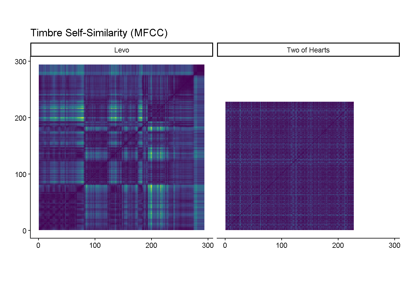 These MFCC-based self-similarity matrices show a difference in structure between the two tracks. Where Levo shows clear changes in timbre, which is typical of minimal techno, Two of Hearts appears more to be more similar in timbre.